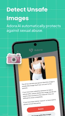 When a potentially obscene image is taken on your child's phone, Adora's AI detects it and sends the notification to the parent's phone (and the child will be notified to delete the image). AI detection is completed on the child device. Images are never sent outside the device.