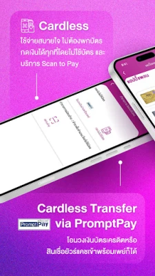 • Cardless : เงินสดไม่ต้องรอ ไม่ง้อบัตร เลือกฟังก์ชั่น Cardless ระบุจำนวนเงินที่ต้องการ ไปที่ตู้ ATM ที่ร่วมรายการ เลือกเมนูกดเงินโดยไม่ใช้บัตร สแกน QR Code ก็รับเงินสดได้เลย