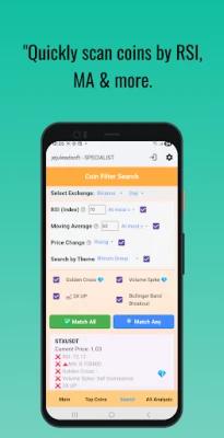 Set custom conditions using indicators such as RSI (Relative Strength Index), MACD (Moving Average Convergence Divergence), moving averages (MA), Bollinger Bands, and Golden Cross signals to quickly discover coins that meet your criteria.