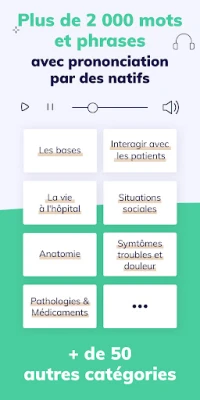 - 11 catégories (Interagir avec les patients, Hôpital, Situations sociales, Symptômes, Examens médicaux, Troubles et douleurs, Pathologies, Médicaments, Soigner les patients, Anatomie, Spécialité, Lire des articles / Suivre une conférence...)