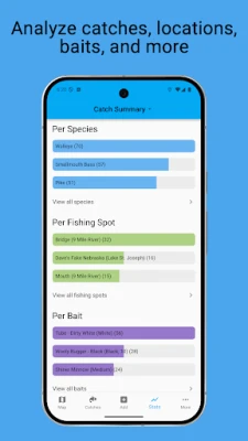 Anglers' Log is a customizable utility app that allows users to track, analyze, and share their catches in the sport of fishing. Manage your own catches, gear, species, locations, baits, and more! Share your trophy catches using your favourite social media site, and analyze your success with the detailed statistics feature.