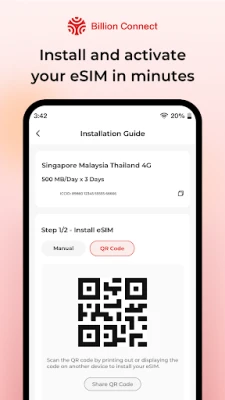 The Billion Connect eSIM plan provides you with mobile data services. You can choose from prepaid local, regional or global eSIM plans to get online in more than 150 countries and regions around the world. Simply download an eSIM, install it on your device and connect to a mobile network when you arrive at your destination!