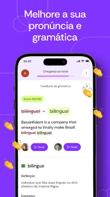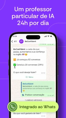O BeConfident oferece acesso instantâneo com conversações de inglês dentro do WhatsApp 24h por dia. Traduções automáticas português-inglês das mensagens de texto durante a aula facilitam o seu aprendizado!