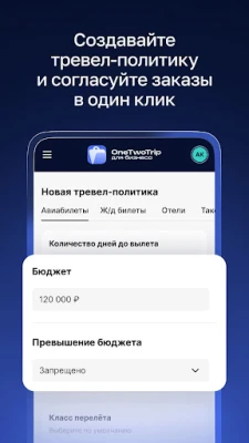 Доступ к удобному личному кабинету в приложении. Скачивайте электронные билеты и маршрутные квитанции по командировкам сотрудников. Просматривайте свои жд и отельные заказы. Обращайтесь в службу поддержки 24/7 из приложения.