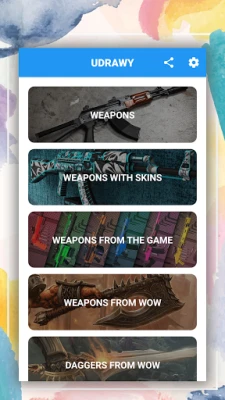 Ứng dụng này chứa một số lượng lớn các bài học vẽ. Tất cả chúng đều được sắp xếp theo danh mục. Vũ khí, động vật, khủng long, thực phẩm, hình vẽ dễ thương, kawaii, những thứ tuyệt vời và nhiều danh mục khác được trình bày trong ứng dụng. Chọn những gì bạn thích nhất. Số lượng bài học vẽ trong các thể loại không ngừng tăng lên và chất lượng của chúng ngày càng được cải thiện. Súng ngắn, lựu đạn, chó sói, hổ, rắn, kiếm, rìu và nhiều thứ khác đều nằm trong các danh mục này.