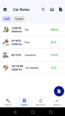 • Car service management: add car repairs, insurances, fines and other expenses. You may separately specify spare parts and labor cost. Attach photos to your car maintenance log. Put in service and make photos of everything that is important: oil producer and grade, payment bill or even the face of the service man! Service operations and paperwork expenses are accounted separately. Usually car services costs are much more interesting to track but it is also important not to forget about insurance expiration date.