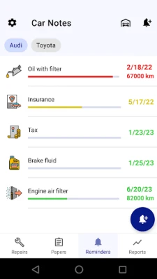 • Car service reminder: set up reminders for regular operations like oil change, filters change, brake fluid change, insurance etc. If you are searching for oil change tracker then that's it. You may set reminders by date or by mileage. When the date of the reminder is close you'll receive notifications about services. Mileage is not necessary field to input car service, but if you put it then you'll receive reminders based on mileage as well as on date - what happens first.