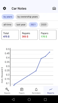 • Full support for several cars. Add cars to the garage and track expenses and services for each one. Set up reminders for the cars. See what car maintenance becomes too expensive and may be that's a good idea to buy newer one.