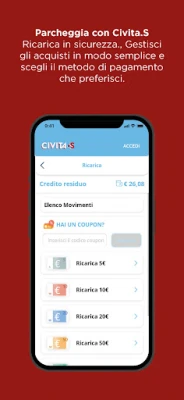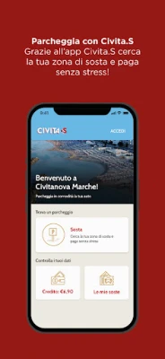 Niente più monete e code ai parcometri. Con Civita.S paghi solo i minuti effettivi di sosta e puoi attivare, prolungare e terminare la sosta da app, in qualsiasi momento e dovunque ti trovi. Riceverai una notifica quando starà per scadere il parcheggio e potrai decidere cosa fare semplicemente usando il tuo smartphone. L’App è collegata al sistema di verifica del gestore dei parcheggi e il controllo avviene direttamente sulla targa dell’auto.