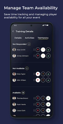 All dates, times, training locations, game days and any other event in one place. Players can easily confirm or deny presence or absence directly via the App.