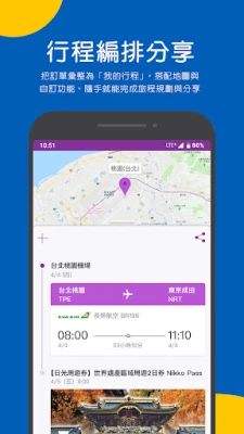 . 輕鬆成為行程規劃大師!機票、飯店、票券一日遊的訂單自動彙整,依你的旅行步調進行編輯,再加入更多景點調味,旅行的劇本就此產生,分享給你的旅伴,一趟說走就走的旅行,就此展開!