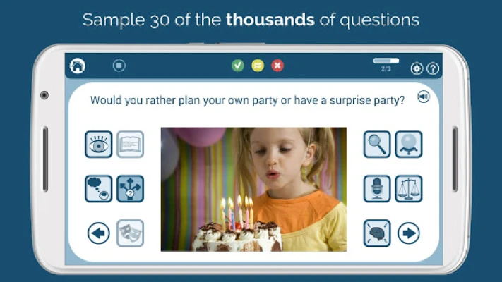 Even those with limited speech have opinions to share; use these opportunities to help find new ways of expressing complex thoughts – the responses you get from this app are sure to surprise, impress, and illuminate strengths & weaknesses in your clients. The vivid pictures and interesting topics in this app will spark discussion, learning, and debate. These questions don't have "right" or "wrong" answers, but there are appropriate answers, well-formed responses, and clearly spoken replies that can be scored.