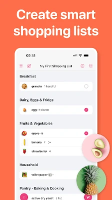 • Smart shopping list sorts items by aisle and syncs across all devices