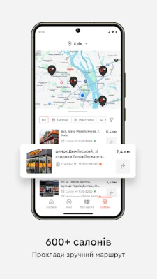 - Прокладайте зручні маршрути до салонів. Адреси, графіки роботи та контакти завжди під рукою.