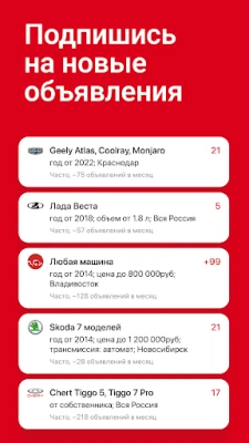 – создавать подписки на объявления по интересующим параметрам автомобиля;