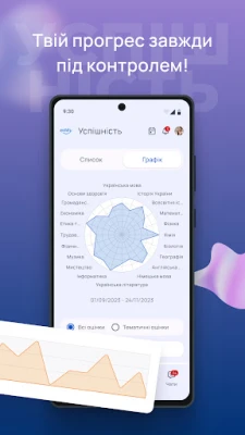 - Графіки успішності — хочеш знати, як ти справляєшся? Динамічні графіки показують твій прогрес у всіх предметах. Стеж за своїми досягненнями і мотивуй себе на нові перемоги!