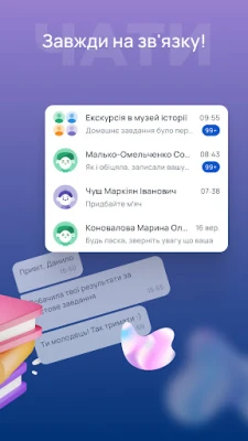 - Завжди під рукою — твої матеріали, оцінки та домашні завдання завжди доступні, де б ти не був.