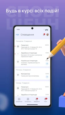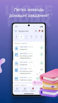 - Електронний щоденник — забудь про заплутані записи та постійне наповнення розкладу! Легко знаходь домашні завдання і памʼятай про дедлайни. Все на одному екрані, без зайвих клопотів!