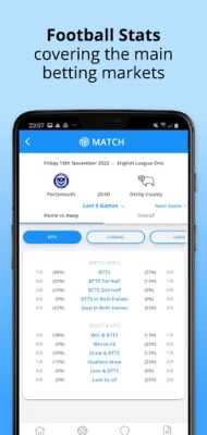 The app provides statistics and predictions for each game in a clear layout, covering all the key betting markets. These include: