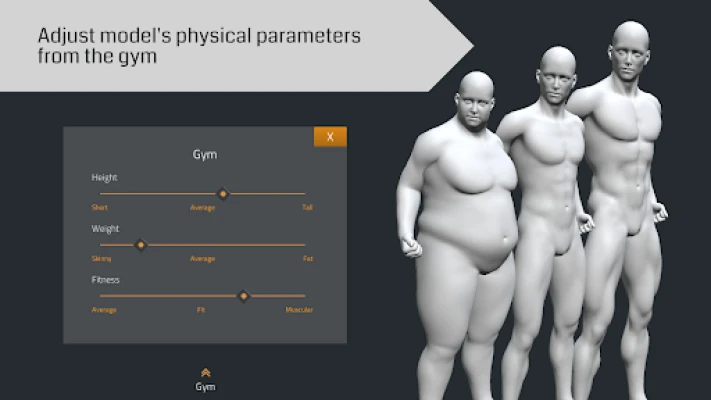 - Phòng tập để điều chỉnh các thông số hình thể của người mẫu, cụ thể là chiều cao, cân nặng và thể lực: Không thích hình dáng của người mẫu? Hãy thay đổi theo ý thích của bạn!