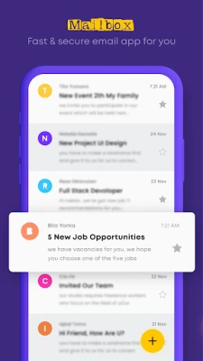This easy-to-use e-mail app for android simplifies email login and allows you to manage various mailboxes with a single click. No need to log in to different email apps for each email account. The email app for gmail will be your mailbox. This email organizer app will strongly enhance your mobile communication and productivity.