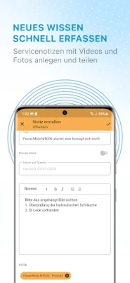 Erstellen und bearbeiten Sie neue Servicenotizen direkt in der App. Ergänzen Sie vorhandenes Servicewissen um weitere Lösungsschritte, Fotos oder Videos und teilen Sie es direkt mit Ihren Teamkollegen.