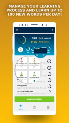 There are many exercises in the app for memorizing words. There are flashcards with words in the first part of the lesson. You can listen to the correct pronunciation, take a look at the meaning and 10 examples of usage. If you already know it, you can skip it and proceed with the next one. After that you should pass a test to consolidate the learned words to define your weakest points. In the third part of the lesson you need to put the missing word into the sentence. These examples present quotations from popular English publications. You can also choose a goal for the day and track your progress with a convenient interface. So that you don't forget about the revising, we have added notifications.