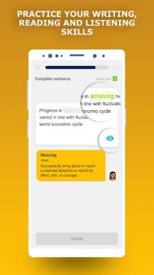Every English word flashcard in this vocabulary builder app comes with full meaning, up to ten examples of usage, phonetics and pronounced by native British speakers so you can immediately perceive the speech by ear. Because of unique learning technique you will keep in mind the correct spelling of the word forever.