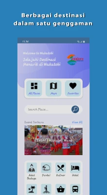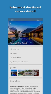 Aplikasi ini akan membantu perjalanan anda agar menjadi menyenangkan. Dalam aplikasi ini terdapat informasi destinasi wisata beserta foto-foto dan cara mengaksesnya serta fasilitas-fasilitas yang dapat dinikmati di Wakatobi.
