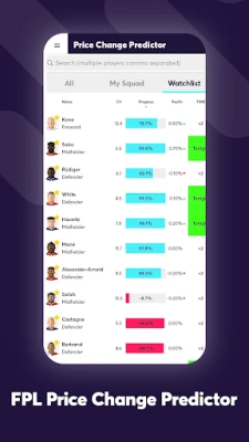 Player Price Change Predictor - Build your squad value by tracking when players will increase and decrease in value, with push notifications to alert you when players are about to rise or fall in value.