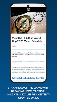 Stay up to date with real-time scores, match stats, fixtures, breaking news, and exclusive content from clubs and international competitions, including the all-new FIFA Club World Cup 2025™. Get team updates, tournament schedules, and analysis so you never miss a moment.