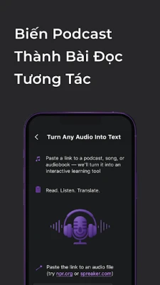 Giờ đây, bạn có thể nghe và đọc cùng lúc. Ngay cả khi podcast bằng ngôn ngữ bạn chưa hiểu hết (như tiếng Tây Ban Nha hoặc tiếng Ba Lan), ứng dụng của chúng tôi cho phép bạn theo dõi toàn bộ bản chép lời và dịch tức thì bất kỳ từ hoặc cụm từ nào. Giống như bạn đang có một máy đọc âm thanh và từ điển thông minh tích hợp trong một công cụ duy nhất.