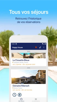 En téléchargeant gratuitement cette application, vous aurez accès à toutes les destinations Happy House. Découvrez de nouvelles idées de séjour, à la mer, à la montagne, en ville ou à la campagne. Choisissez la maison du bonheur qui vous convient ! Dans nos Happy House, une cohérence d'esprit sur la qualité des services et de l'accueil ... une expérience unique à chaque fois correspondant à votre vision de votre séjour pour satisfaire tous vos invités ... Téléchargez gratuitement dès maintenant cette application HappyHouse et entrez dans un monde garanti de bonheur, de découvertes et d'expériences. Conservez cette application pour trouver chacun de vos lieux de bonheur adaptés à vos moments importants de vie.