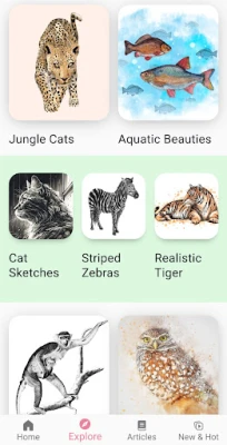 Ứng dụng này cũng có một số tùy chọn dạy bạn vẽ một số loại động vật. Bạn có thể vẽ động vật của riêng mình, động vật trong vườn thú, động vật hoang dã và động vật nước bằng video hướng dẫn trong ứng dụng. Ứng dụng học vẽ động vật dạy bạn vẽ các loài động vật thật cùng với các bản phác thảo bằng bút chì của một số loài động vật khác nhau theo từng bước.