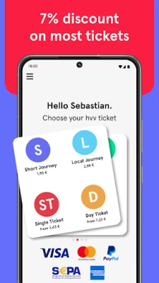 Whether it's a short journey, single ticket or group ticket – with hvv switch, you can conveniently buy public transport tickets via the app and save 7% on most fares. Pay securely using PayPal, SEPA direct debit or credit card (Visa, Mastercard, Amex) and add your mobile ticket straight to your wallet.