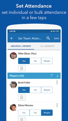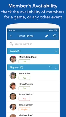 • Attendance and player availability: Team members or parents can set their availability for upcoming events. Coaches can mark member attendance as present or absent for the events.