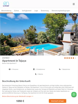 Erleben Sie einen unvergesslichen Urlaub mit La Palma 24, Ihrem perfekten Partner für die ideale Unterkunft auf der schönen Insel La Palma. Wir bieten eine exklusive Auswahl an Immobilien, von gemütlichen Apartments bis hin zu luxuriösen Villen, alle ausgestattet mit modernen Annehmlichkeiten und in den besten Lagen der Insel.