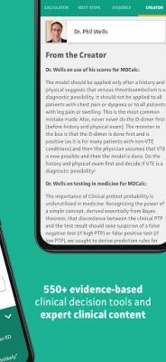 From iMedicalApps in 2016: “The evidence based medicine (EBM) components of the medical app are what really set MDCalc apart from its peers... The MDCalc app gives brief summaries of the critical studies concerning the medical calculator, links to the studies on PubMed as well as “pearls/pitfalls”, “next steps” and expert commentary from the authors of the calculators.” - iMedicalApps “MDCalc app, the best online medical calculator is now an app”