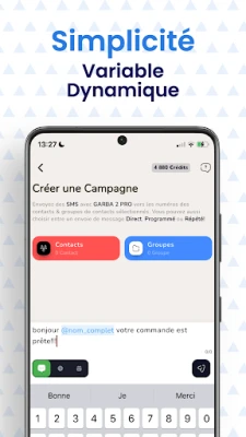 - Vous pouvez envoyer des SMS direct - Vous pouvez envoyer des SMS programmés pour une certaine date - Vous pouvez envoyer des SMS recurrent qui seront envoyés aux jours et heures déterminé de manière continue. - Accédez aux contacts present dans votre répertoire