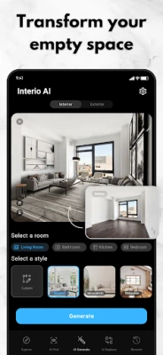 Bạn có tò mò căn phòng của mình sẽ trông như thế nào không? Interio giúp bạn thực hiện việc này một cách dễ dàng. Chỉ cần chụp ảnh, chọn phong cách thiết kế (hoặc tự tạo phong cách) và để AI thông minh của chúng tôi biến đổi không gian của bạn. Không cần kỹ năng thiết kế, chỉ cần có kết quả tức thời và tuyệt đẹp.