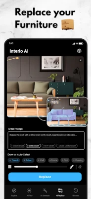 🛋️ Thay thế đồ nội thất và đồ trang trí Bạn muốn thử ghế sofa hoặc đèn chiếu sáng mới không? Chỉ cần chạm để thay thế các mục trong ảnh của bạn.