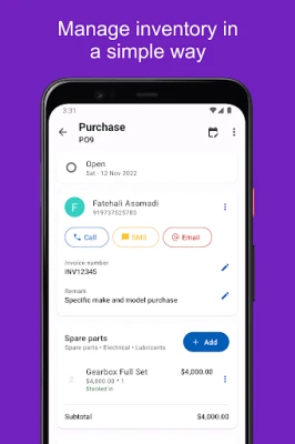 Inventory Management: Includes a barcode scanner, item categorization, stock alerts, and purchase order links to repair orders.