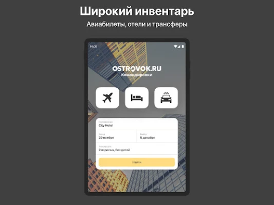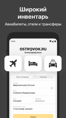 Ostrovok.ru Командировки — сервис для лёгкой организации деловых поездок по специальным тарифам. Более 1,6 млн объектов размещения в 220 странах мира, авиабилеты и трансферы от сотен поставщиков по сниженным b2b-тарифам — вы легко найдёте подходящие варианты под любой бюджет, а моментальная выгрузка отчётности упростит подготовку документации по поездке.