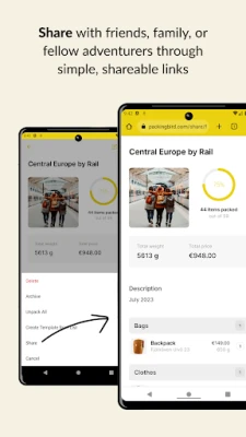 - Shareable packing lists: Share your packing lists with friends, family, or fellow adventurers using shareable links.
