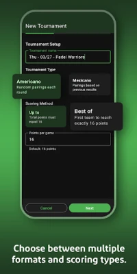 • Two tournament formats: Americano (random pairings) and Mexicano (ranking-based pairings)