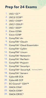 Prep for 24 IT & Cybersecurity certification exams, including: