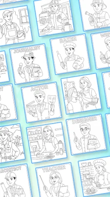 Hundreds of professions coloring pages: Doctor, firefighter, astronaut, chef, teacher, artist, police officer, pilot, engineer, farmer, and many more.