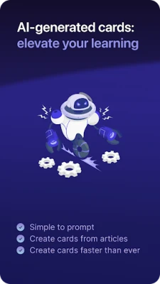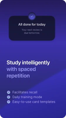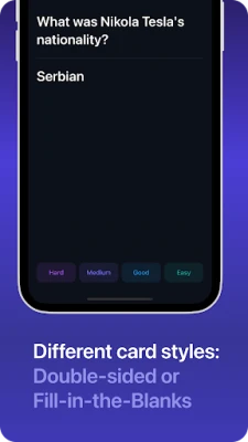 Create your own flashcards, or let AI generate them for you. Choose between two different card layouts that keep your learning fresh and engaging. And with our intelligent spaced repetition algorithm, you'll review your cards at optimal intervals, ensuring maximum retention and rapid progress.
