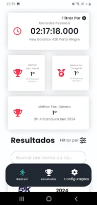 Após a corrida, o Runking fornece resultados detalhados e precisos. Confira sua posição geral, divisão por categorias, tempo total e média por quilômetro. Os corredores podem facilmente comparar suas performances em diferentes corridas, estabelecer metas pessoais e acompanhar sua evolução ao longo do tempo. Com o Runking, cada corrida é uma oportunidade para superar seus próprios limites.