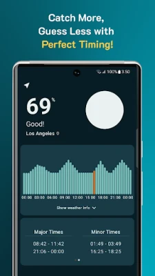 Features: • Rise-Zenith-Set Times for Moon and Sun • Daily Activity Rate • Hourly Activity on Chart • Major & Minor Activity Periods • Moon phases • 5-Day Weather Forecasts (including barometric data) • Personal To-do List • Favorite Location Saving